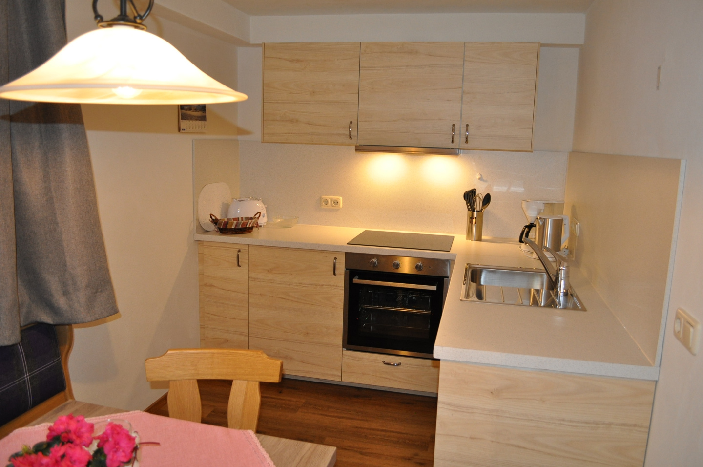 Neue Ferienwohnung mit Südbalkon, Wohn-Schlafraum, Wohnküche, Dusche und WC.